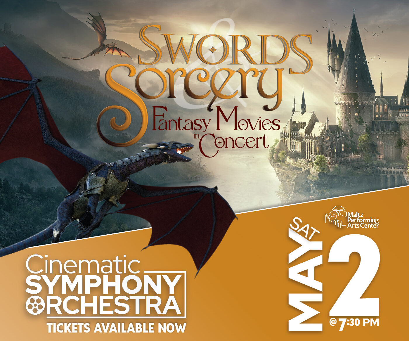 Prepare to be swept away into realms of magic, myth, and adventure as the Cinematic Symphony Orchestra presents SWORDS AND SORCERY – Fantasy Movies in Concert. On Saturday, May 2, 2026, the Maltz Performing Arts Center transforms into a portal to fantastical worlds, where sweeping strings and soaring voices bring your favorite cinematic adventures to life.